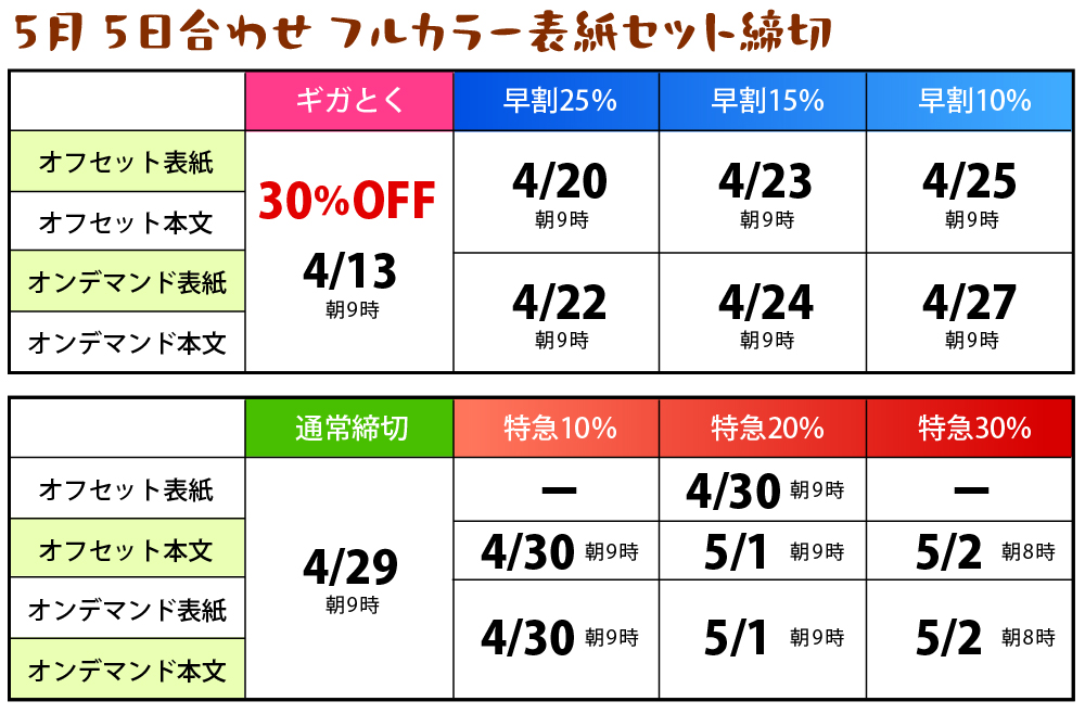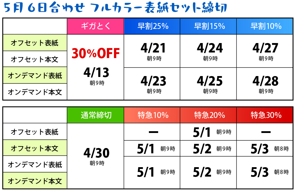 小説本やオールカラー本など、その他商品の締切日は締切一覧をご確認ください。